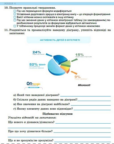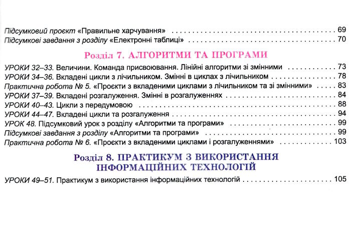 Робочий зошит з інформатики містить: завдання до кожного уроку підсумкові завдання до кожного розділу 6 практичних робіт проекти, а також різноманітні завдання, спрямовані на краще засвоєння учнями навчального матеріалу і набуття як предметних, так і ключових компетентностей. До уроків наведено запитання для рефлексії.