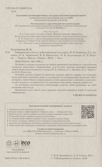 Інформатика 6 клас Робочий зошит до підручника Й. Я. Ривкінда, Т. І. Лисенко, Л. А. Чернікової, В. В. Шакотька. Посібник складено відповідно до чинної навчальної програми та з урахуванням концепції підручника Інформатика для 6 класу закладів загальної середньої освіти авторського колективу у складі: Й. Я. Ривкінд, Т. І. Лисенко, Л. А. Чернікова, В. В. Шакотько.