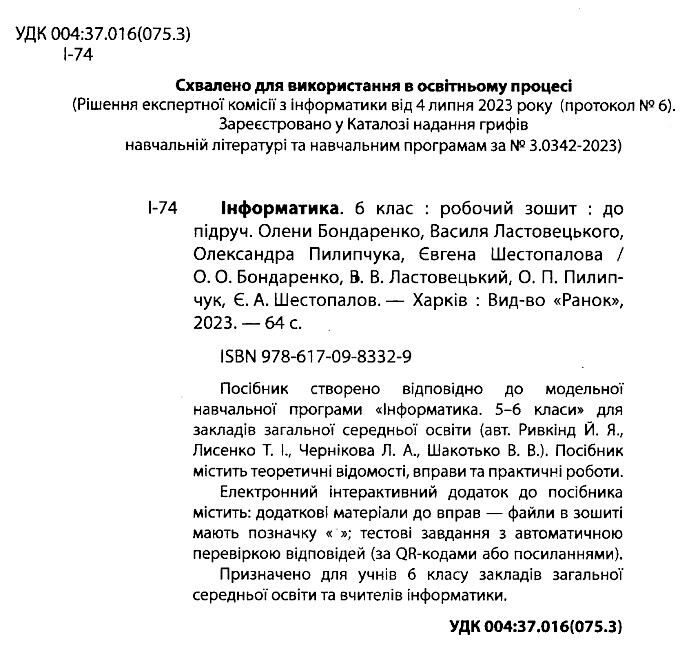 Посібник створено з урахуванням побудови підручника авторів О. О. Бондаренко, В. В. Ластовецького, О. П. Пилипчука, Є. А. Шестопалова. Посібник містить вправи та практичні роботи з покроковим описом. На інтерактивній навчальній платформі до посібника вміщено: додаткові матеріали до вправ — файли у зошиті мають позначку «*»; тестові завдання з автоматичною перевіркою відповідей (за QR-кодами та посиланнями). Призначено для учнів 6 класу закладів загальної середньої освіти та вчителів інформатики.