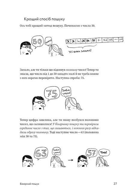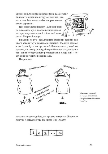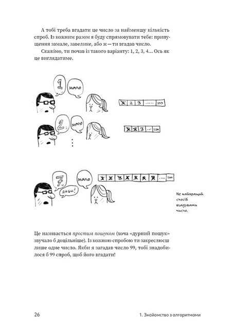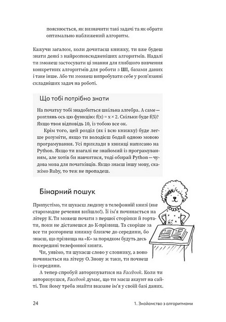 Я наводжу багато прикладів. Моя ціль — спростити візуалізацію концептів, а не заплутати нагромадженням незрозумілих символів. Так, я візуал, і ця книжка просто переповнена малюнками. Зміст ретельно продумано. Усі алгоритми цієї книжки — практичні. Я вважаю їх корисними в моїй професії програмного інженера, і вони забезпечують хорошу основу для інших, складніших тем.