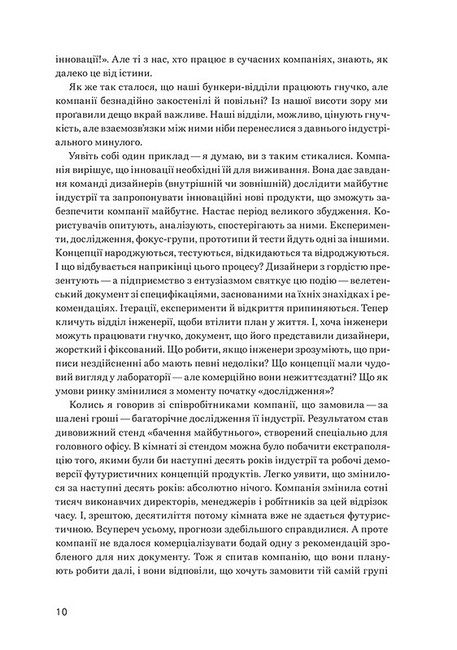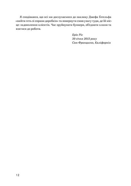 «Минуло роки чотири з моменту, коли я вперше почав говорити й писати про нову концепцію, що називається Lean Startup, і менше ніж рік відтоді як я опублікував свою книжку Lean Startup: How Today’s Entrepreneurs Use Continuous Innovation to Achieve Radically Successful Businesses («Lean Startup: як нинішні підприємці використовують постійні інновації, щоби досягти радикально успішного бізнесу») (Crown Business). За цей час я бачив, як ці ідеї зростали й розповсюджувалися — від індустрії до індустрії, від сектора до сектора, від функції до функції. Щоразу коли ми відкривали незвідану землю, ми покладалися на далекоглядних лідерів, що допоможуть перекласти ключові принципи й розробити нові процеси для їх упровадження