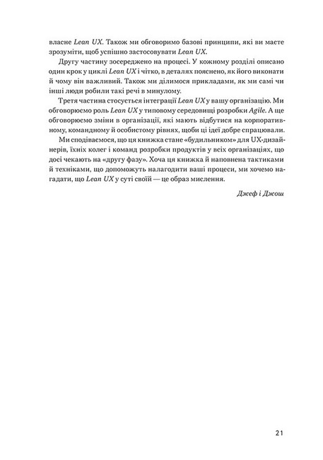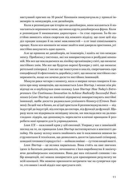 Lean UX — важливий крок у цій еволюції. Уперше у нас є зовнішній погляд на те, як принципи Lean Startup застосовуються в контексті дизайну. На цьому шляху книга знайомить нас із важливими новими інструментами й техніками, що дозволяють досягти ідеальної співпраці, швидкої готовності продуктів і — найважливіше — суттєво вищої якості».