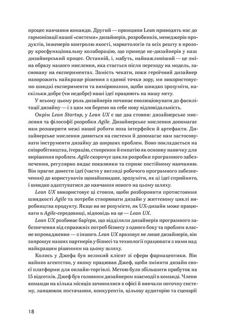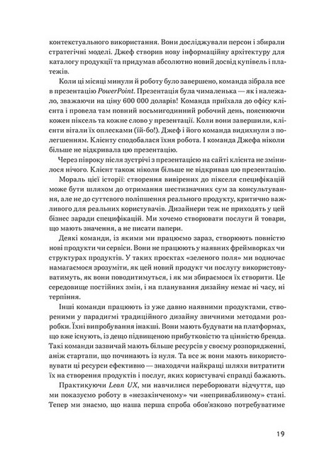 «Lean UX розбиває бар’єри, що відділяли дизайнерів програмного забезпечення від справжніх потреб бізнесу з одного боку та проблем власне впровадження — з іншого. Lean UX враховує не лише дизайнерів, він запрошує наших партнерів у бізнесі та технології працювати з нами над найкращим рішенням на цьому шляху. Колись у Джефа був великий клієнт зі сфери фармацевтики. Він найняв агентство, у якому працював Джеф, щоби змінити дизайн своєї платформи для онлайн-торгівлі. Метою було збільшити прибуток на 15 відсотків. Джеф був головним дизайнером взаємодії в команді. Члени команди на кілька місяців зачинилися в офісі й вивчали поточну систему, ланцюжок постачання, конкурентів, цільову аудиторію та сценарії контекстуального використання. Вони досліджували персон і збирали стратегічні моделі. Джеф створив нову інформаційну архітектуру для каталогу продукції та придумав абсолютно новий досвід купівель і платежів. Коли ці місяці минули й роботу було завершено, команда зібрала все в презентацію PowerPoint. Презентація була чималенька — як і належало, зважаючи на ціну 600 000 доларів! Команда приїхала до офісу клієнта і провела там повний восьмигодинний робочий день, пояснюючи кожен піксель та кожне слово у презентації. Коли вони завершили, клієнти вітали їх оплесками (їй-бо!). Джеф і його команда видихнули з полегшенням. Клієнту сподобалася їхня робота. І команда Джефа ніколи більше не відкривала цю презентацію. Через півроку після зустрічі з презентацією на сайті клієнта не змінилося нічого. Клієнт також ніколи більше не відкривав цю презентацію. Мораль цієї історії: створення вивірених до пікселя специфікацій може бути шляхом до отримання шестизначних сум за консультування, але не до суттєвого поліпшення реального продукту, критично важливого для реальних користувачів. Дизайнери теж не приходять у цей бізнес заради специфікацій. Ми хочемо створювати послуги й товари, що мають значення, а не писати папери».
