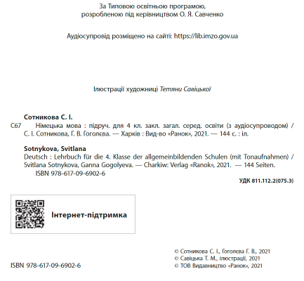 Підручник Німецька мова DEUTSCH 4 клас НУШ з аудіосупроводом Сотникова С. Гоголєва Г. Ранок. Укладено за принципами концепції Нової української школи.