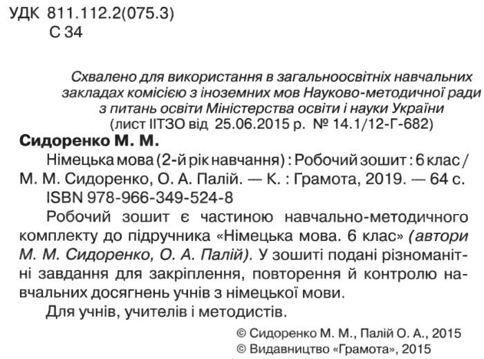 Робочий зошит Німецька мова 6 клас 2-й рік навчання Програма 2019 є частиною навчальнометодичного комплекту до підручника Німецька мова 6 клас автори М. М. Сидоренко, О. А. Палій.