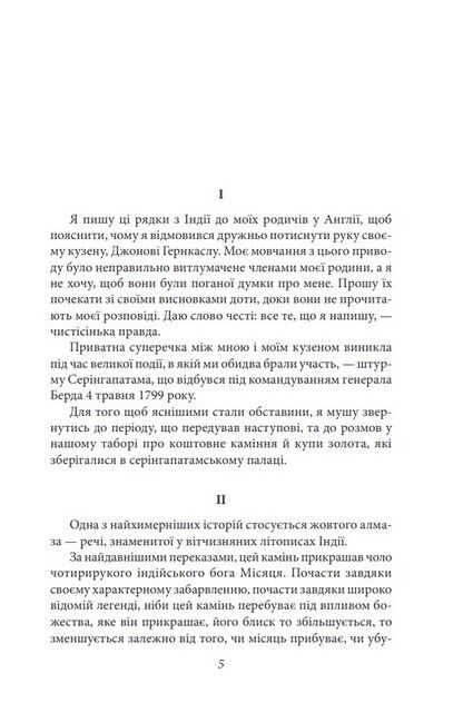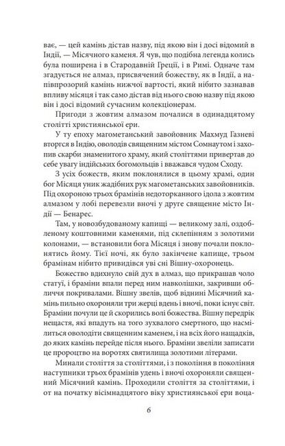 «Місячний камінь» вважається чи не першим детективним романом. Це таємнича романтична історія, в якій є місце і любові, й пригодам, і детективній інтризі. Молода дівчина, Речел Веріндер, згідно із заповітом свого дядька, який воював в Індії, отримує в день повноліття великий алмаз надзвичайної краси. Вона не знає, що Місячний камінь (таку назву має алмаз) викрадений з індійського святилища і три індуських жерці йдуть по його сліду, а індуїстський бог Вішну передбачив нещастя тому, хто наважиться їм заволодіти.