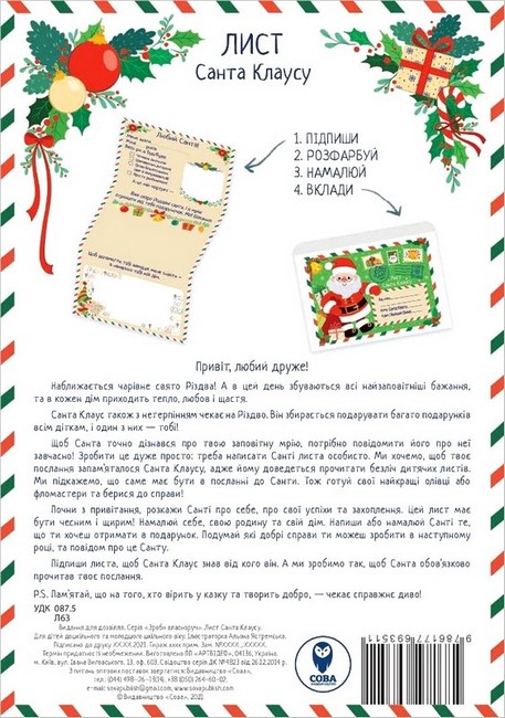 Чудовий подарунок до зимових свят для малечі – «Лист Санта Клаусу». Адже це не просто лист, а цікаві завдання та улюблений герой. Малеча розповість про себе, визначиться з подарунком, допоможе Санті знайти свій дім, а також запланує хороші справи на наступний рік. А для того, щоб Санта точно знав про твоє бажання і доставив подарунок саме до твоїх дверей, необхідно завчасно попередити його. Тож беріть найяскравіші фломастери й олівці, покладіть лист перед собою і почніть заповнювати його!