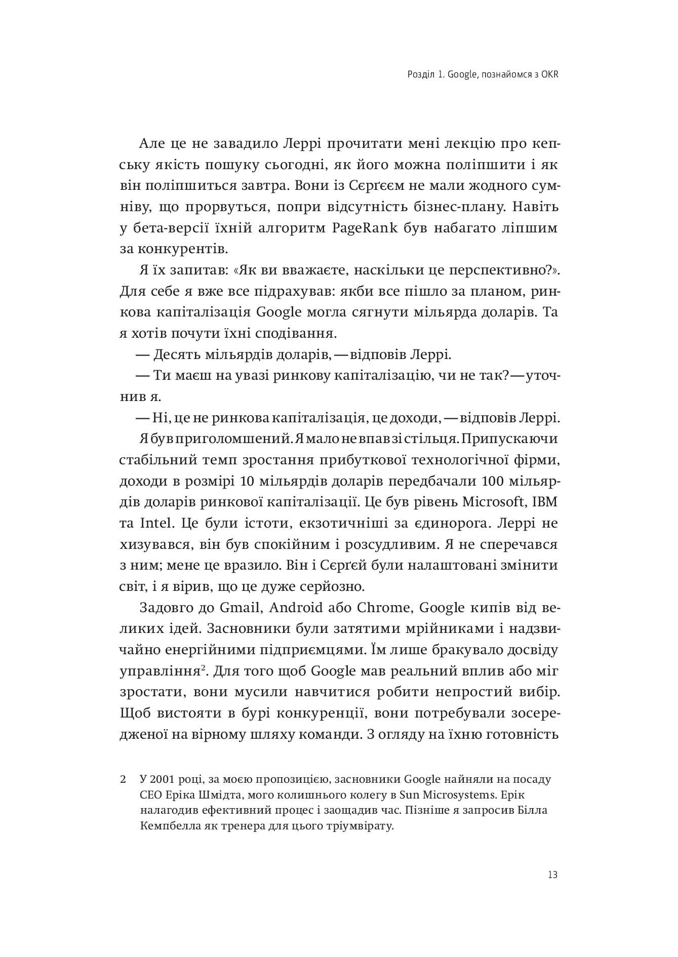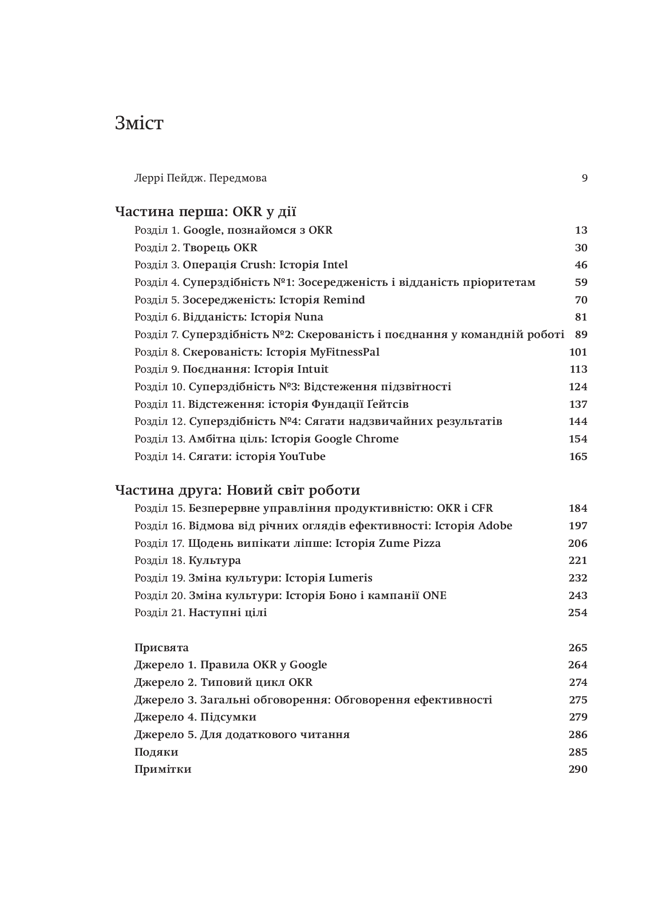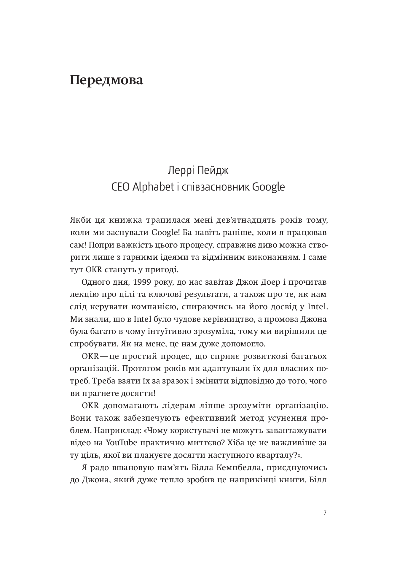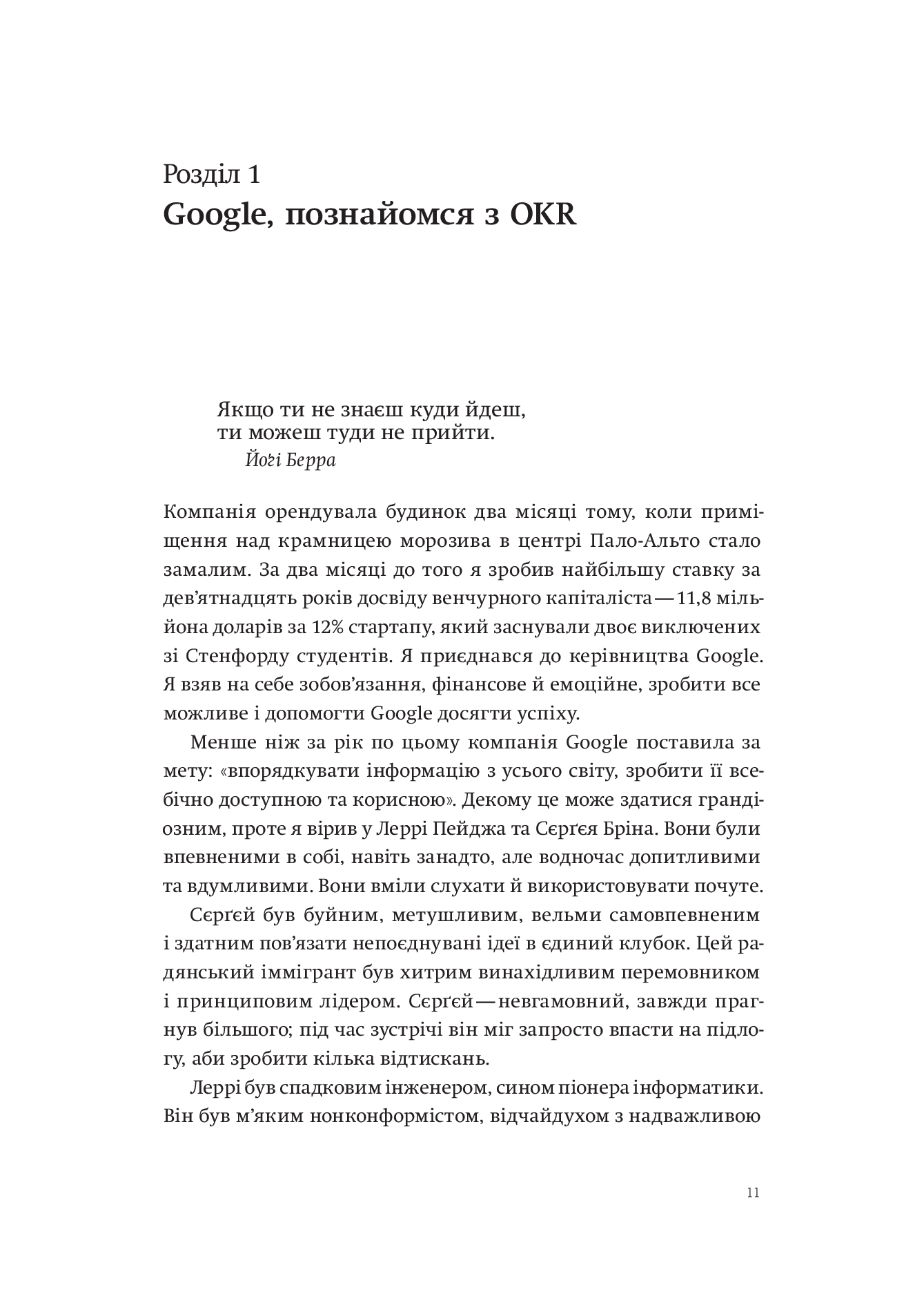 Ця книжка легендарного американського інвестора Джона Доера є надзвичайно цікавим і сміливим поєднанням прикладної бізнес-літератури й особистих історій становлення низки феноменально успішних глобальних і локальних бізнесів та громадських організацій – від велетня Google до інноваційної піцерії Zume Pizza, від благодійної кампанії ONE лідера групи U2 Боно до Фундації Ґейтсів. Більшість із них завдячують Джону Доеру як інвестору (наприклад, Google, адже саме Доер вклав у "гаражний" стартап перші серйозні гроші), й усі – як наставнику, вчителю, пораднику. Ті, хто шукає практичну, покрокову інструкцію впровадження OKR – цілей і ключових результатів, у своїй компанії або організації, знайдуть у праці Доера вичерпний і вправно написаний підручник. Проте насправді унікальною цю книжку робить історія спадковості, вдячності й передачі знань від покоління до покоління. Не зовсім те, чого очікують від популярної бізнес-літератури, а отже – свідчення, що величезні гроші та найгучніший успіх можуть бути також історіями взаємної поваги і людяності.