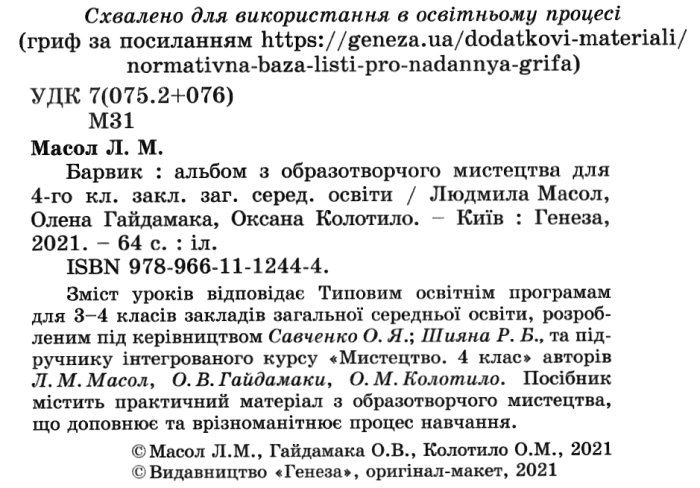 Альбом Барвик Образотворче мистецтво 4 клас НУШ Масол Л. Генеза