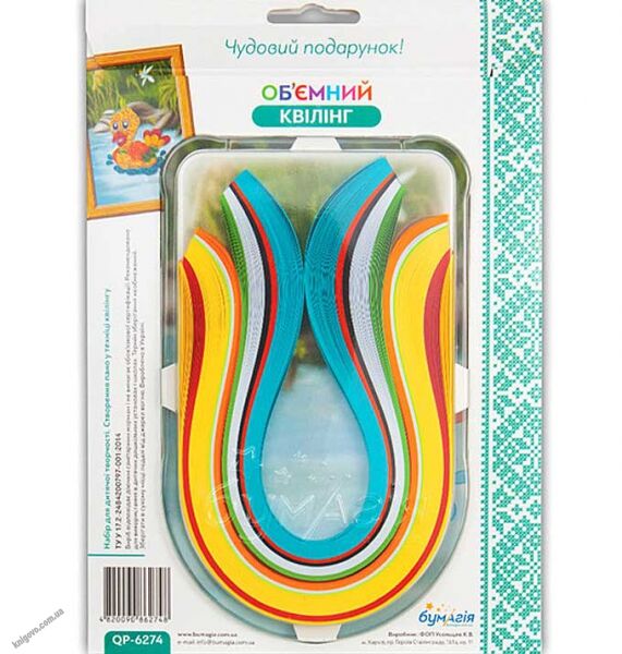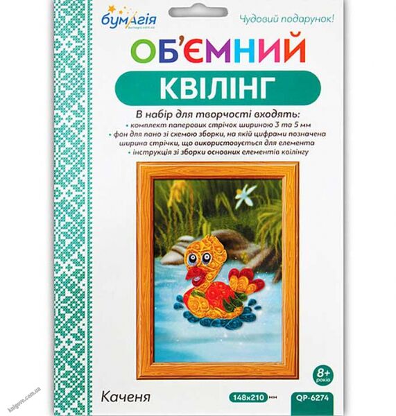 Об'ємний квілінг Каченя QP-6274 Бумагія. У набір квілінгу для творчості входять: фон для панно з малюнком-схемою складання квілінгу, комплект паперових стрічок квіллінга шириною 5 мм і 3 мм і щільністю 80 г / м2, інструкція по збірці основних елементів.
