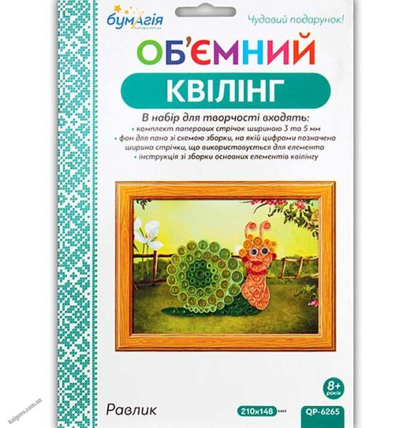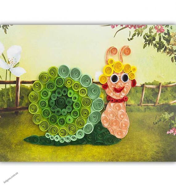 Об'ємний квілінг Равлик QP-6265 Бумагія. У набір квілінгу для творчості входять: фон для панно з малюнком-схемою складання квілінгу, комплект паперових стрічок квіллінга шириною 5 мм і 3 мм і щільністю 80 г / м2, інструкція по збірці основних елементів.