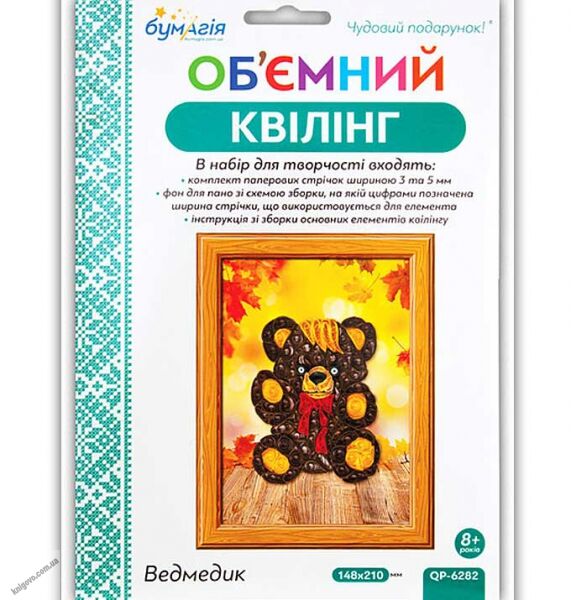 Об'ємний квілінг Ведмедик QP-6282. Для дітей від 8 років. Розмір готового виробу 148 х 210 мм. Комплект для створення панно в техніці квілінгу, для початківців. Використання стрічок різної ширини надає готовому панно ефект обсягу, що і визначило назву колекції. Набір укладений в барвисту упаковку з прозорим пластиковим блістером.