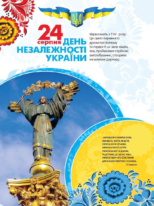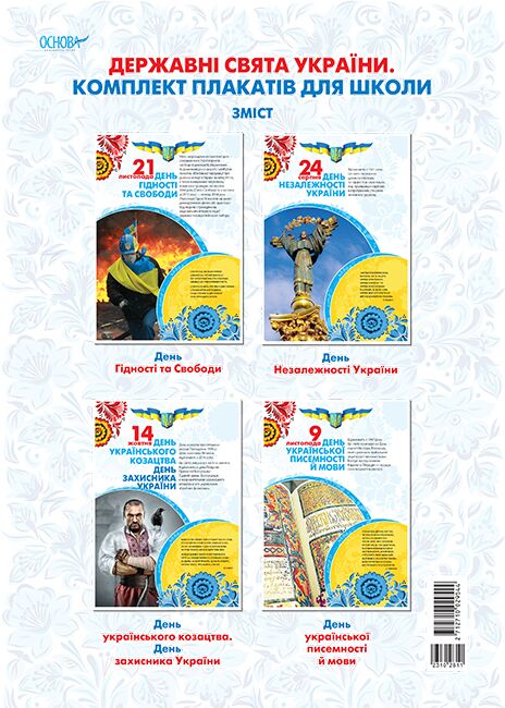Комплект містить 4 яскравих плакати, на яких стисло подано інформацію щодо свят та видатних дат України (історичні довідки, уривки літературних творів). Плакати висвітлюють одні із найважливіших свят та видатних дат України: • День Незалежності України (24 серпня); • День Гідності та Свободи (21 листопада); • День українського козацтва. День захисника України (14 жовтня); • День української писемності й мови (9 листопада). До кожного свята дібрано історичну довідку та уривок з літературного твору.