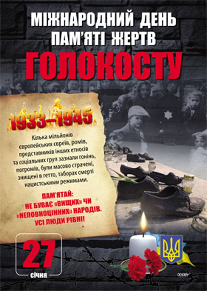 Комплект містить 4 плакати до Днів пам’яті жертв Голодоморів та Голокосту, загиблих під час Другої світової війни та Героїв Небесної Сотні. Плакати допоможуть пригадати скорботні події в історії України, вшанувати всіх постраждалих та пам’ять про загиблих. Можуть бути використані для оформлення класів, шкільних та позашкільних навчальних закладів, установ у скорботні дні та під час проведення пам’ятних заходів.