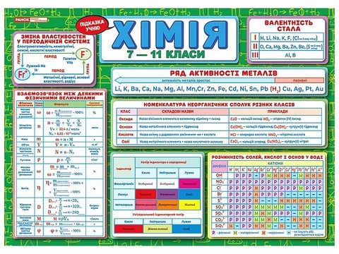 Двостороння підказка з хімії для учнів 7-11 класів, надрукована на крейдованому папері щільністю 300 мг.