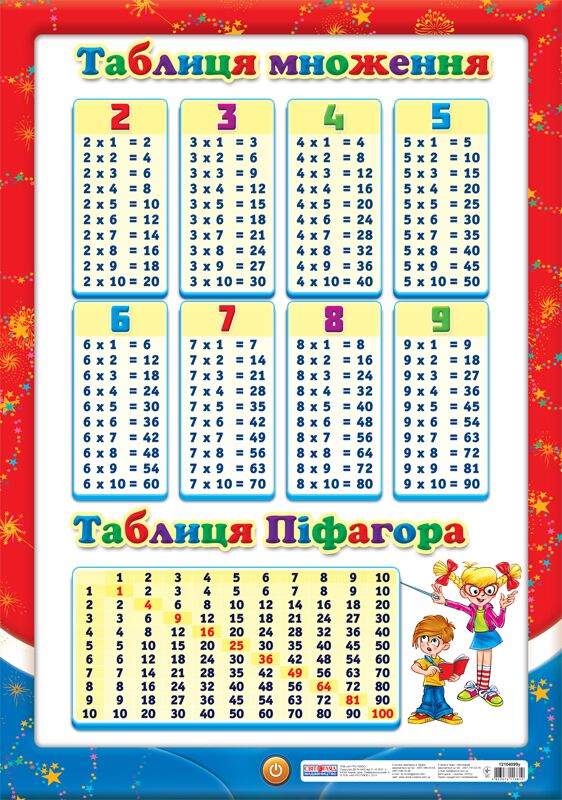 Пропонуємо плакат з таблицею множення для шкільного класу або дитячої кімнати вдома. Крупні цифри та зручні стовпчики дозволять дитині легко запам’ятати значення. Таблиця Піфагора розкриє багато математичних закономірностей та перетворить вивчення таблиці множення на цікаву гру.