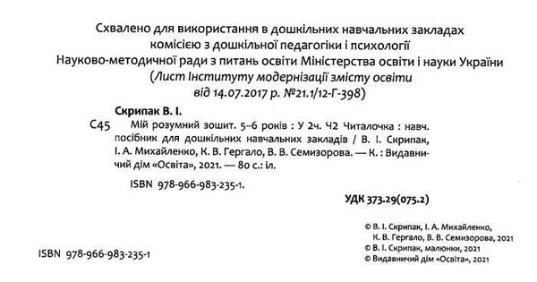 "Мій розумний зошит. 5-6 років. Читалочка. Частина 2" авторства В.І. Скрипака та видавництва "Освіта" є продовженням попередньої частини і призначена для дітей віком 5-6 років.