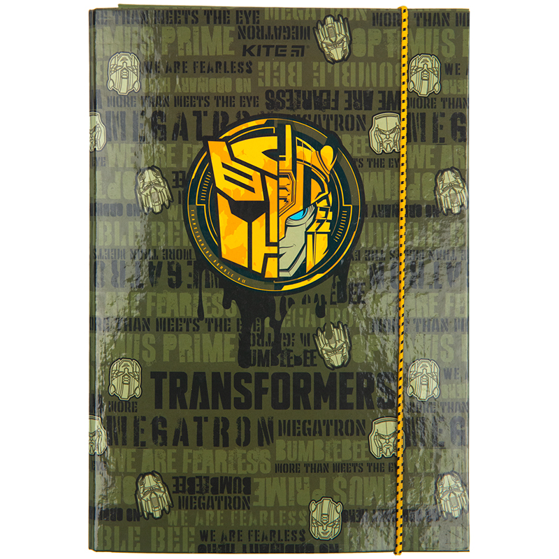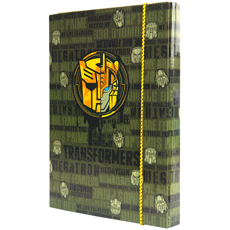 Об'ємна картонна папка для зошитів Transformers з яскравим забарвленням закривається на гумці.