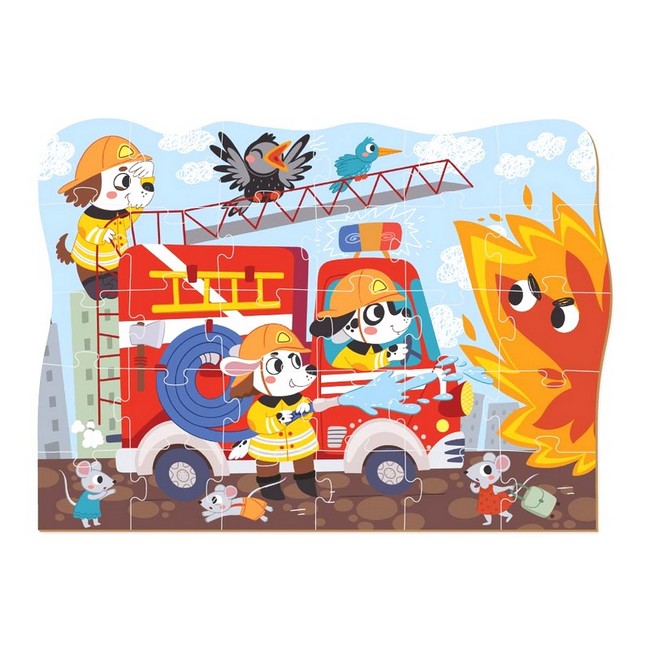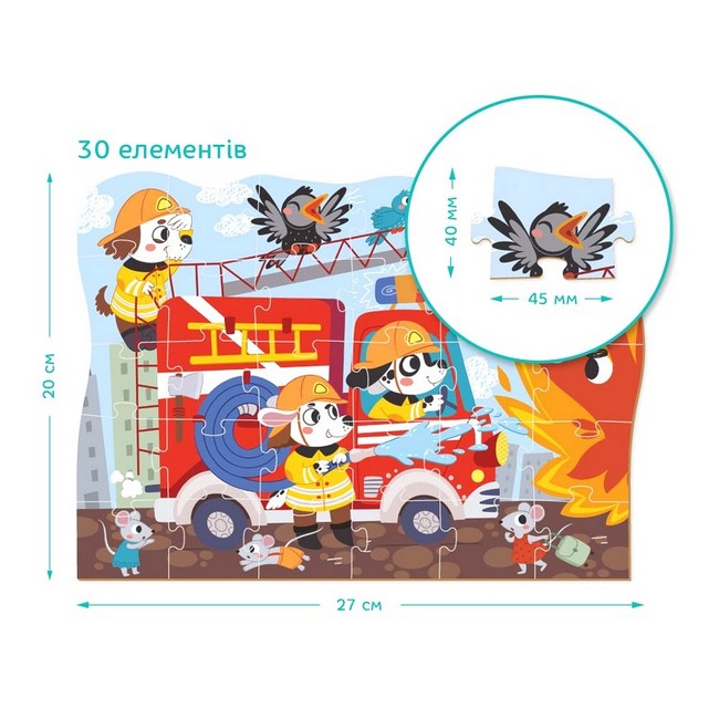 Надзвичайна ситуація! У будиночку пані Мишки сталася пожежа, тож їй на допомогу поспішає пожежна бригада цуциків. Вони вмикають сирену на своїй яскравій червоній машинці, та летять по місту на допомогу. Цікаві та яскраві сюжети — на пазлах серії «Транспорт», що стануть фаворитами любителів машинок. Деталі у пазла великі, виконані зі щільного картону та витримають будь-яку гру. Підходить для дітей від 3-х років, допомагає їм розвивати дрібну моторику, координацію та просторове мислення.