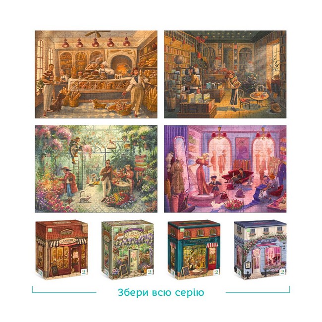 Особливість цієї серії в тому, що пазли знаходяться в коробках з зображенням фасадів, які з миттєвістю переносять вас до внутрішнього світу книжкового магазину. З кожним з'єднанням елементів ви порините в атмосферу літературних відкриттів та затишку цього унікального закладу.