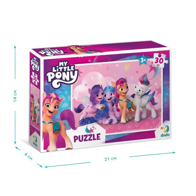 Пригоди улюблених персонажів з мультфільму “My Little Pony: Нове покоління” на яскравих та цікавих пазлах Dodo. Нові поні-подружки — Санні Старскаут, Іззі, Піп та Зіп запрошують малят погратися та розважитись у чарівному та рожевому світі поні.