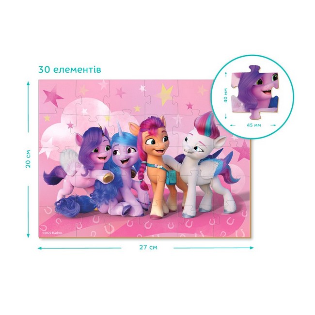 Малята можуть вивчати нові слова, вигадувати історії та головне — дізнатися про дивовижні пригоди поні. Пазли на 30 елементів розраховані на дітей від 3-х років, вони яскраві, виконані з цупкого картону та зручні у грі.