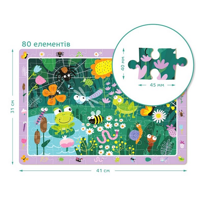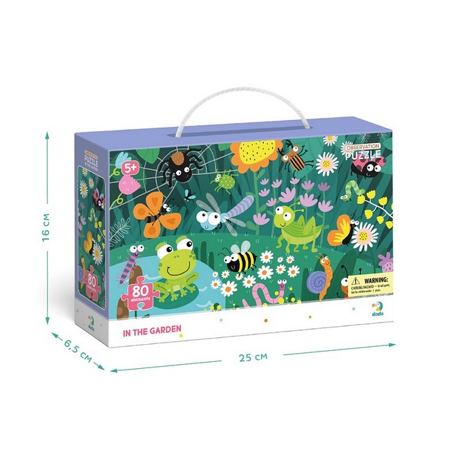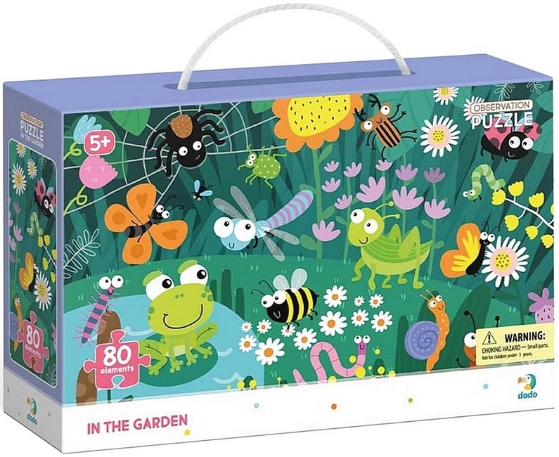 Що роблять комашки, сховавшись у глибині садка, де ви не можете їх побачити? Звичайно — влаштовують шалену вечірку. Вони прикрашають все навколо квітами, збираються навколо ставка та обговорюють плітки, які підслухали упродовж дня. А ви побачили всіх комашок? Особливість обсерваційного пазла — кольорова рамка, на якій зображені елементи пазлу. Задача дитини — знайти картинки з рамки на великому пазлі. Гра з таким пазлом вчить малечу увазі до деталей та швидкості реакції.