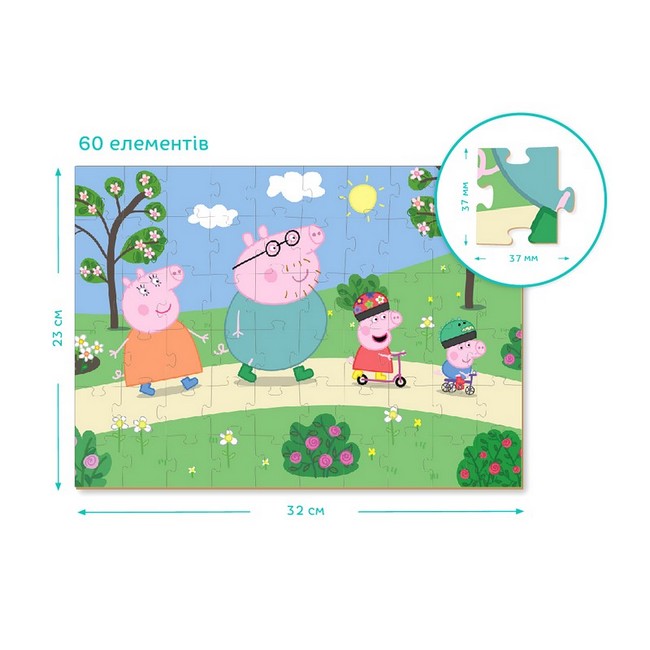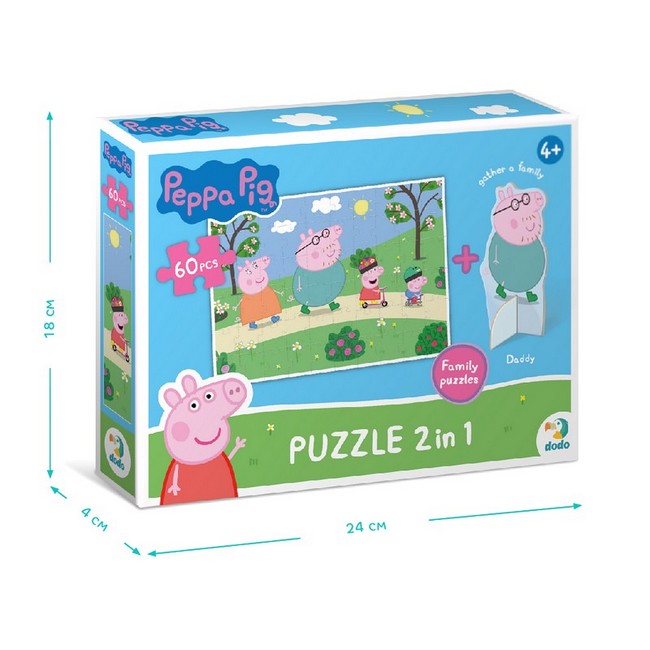 Пеппа, її брат Джордж та їхні батьки пішли гуляти. Який гарний парк! Тут можна кататися не велисопеді чи самокаті, гратися та ловити метеликів. Головне при розвагах — не забувати про безпеку. У комплекті — фігурка з Татом Свином. Краще за пазл від Dodo може бути тільки пазл, у додаток до якого буде колекційна фігурка з улюбленим персонажем. І у нас є такі — з веселеми героями “Свинки Пеппи” У серії є 4 пазли, які зображують пригоди родини свинок. Та у комплекті — фігурка з одним з персонажів. Збери всі!