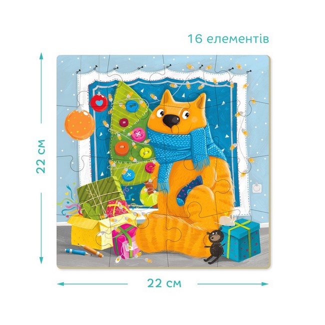 Котик обожнює дарувати подарунки. До цього Різдва він вже зібрав та прикрасив пакуночки для своїх друзів. Зимова серія вийшла чарівною — яскраві пазли з милими малюнками та святкові сюжети. Тобі захочеться зібрати всю колекцію. Мальовничі картинки захоплюють увагу дитини, а завдяки великим деталям та щільному картону пазл витримає будь-яку гру. Підходить для дітей від 3-х років, допомагає їм розвивати дрібну моторику, координацію та просторове мислення.