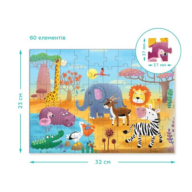 Що роблять африканські тваринки, коли стає особливо спекотно? Вони йдуть відпочивати до оазису, де можна відпочити у сутінку, попити водички та подивитись на яскравих рибок. Робимо навколишній світ чарівним та яскравим за допомогою серії «Тварини», що стануть фаворитами маленьких фантазерів. Деталі у пазла великі, виконані зі щільного картону та витримають будь-яку гру. Підходить для дітей від 4-х років, допомагає їм розвивати дрібну моторику, координацію та просторове мислення.