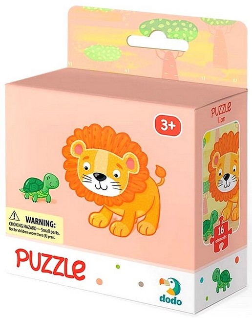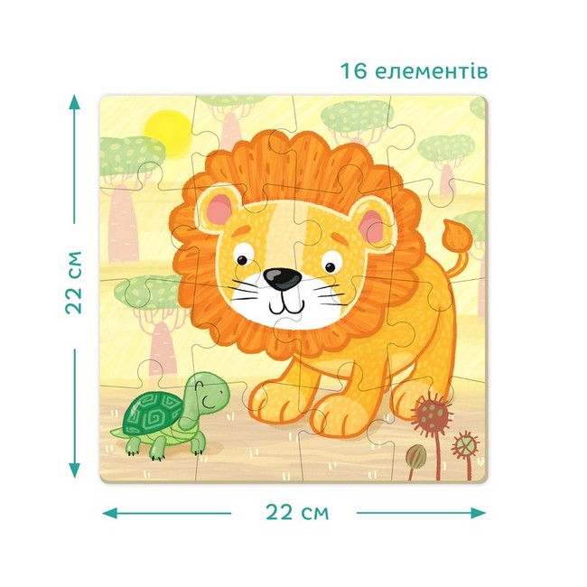 Пухнасте левеня відправляється у подорож саваною разом із черепашкою, своїм найліпшим другом. Збираймо цілий зоопарк у себе вдома — цуцик, левеня, жирафа, кошеня і багато інших тваринок у серії на 16 елементів. Мальовничі картинки захоплюють увагу дитини, а завдяки великим деталям та щільному картону пазл витримає будь-яку гру. Підходить для дітей від 3-х років, допомагає їм розвивати дрібну моторику, координацію та просторове мислення.