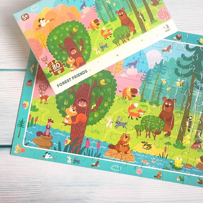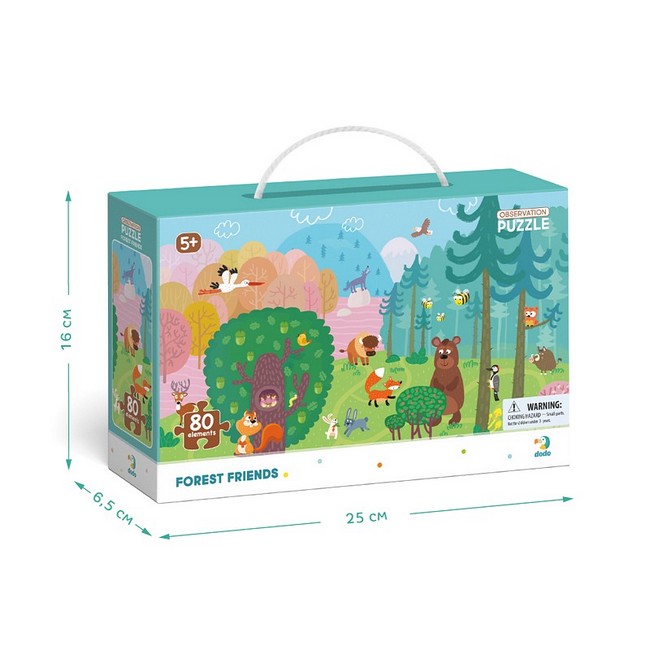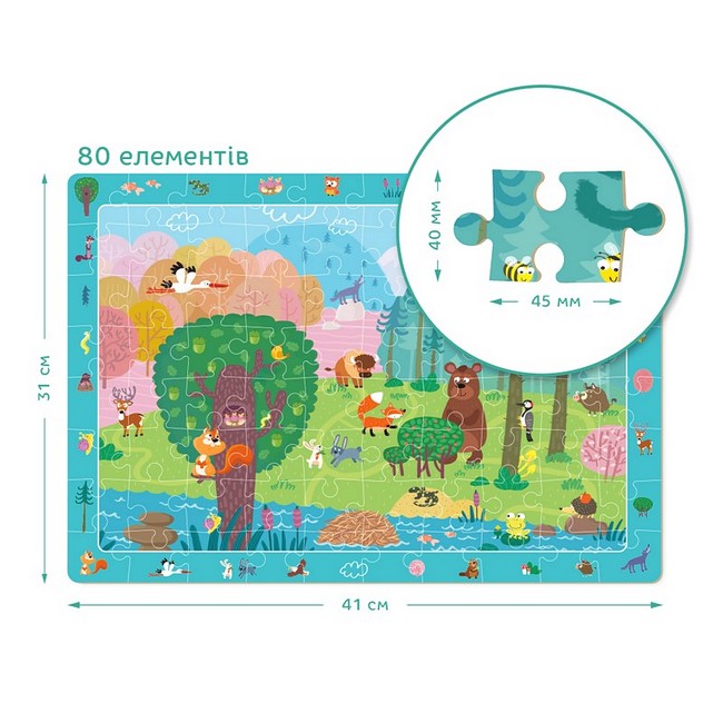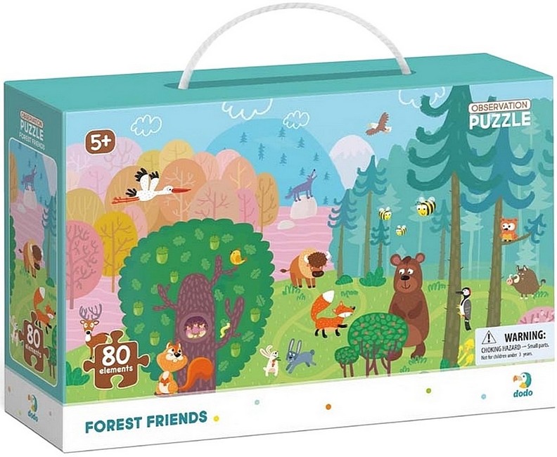 Скільки цікавого відбувається у лісі! Пташки співають, ведмедик шукає, де бджілки сховали свій мед, вовчик кличе своїх друзів погратися. А що бачите ви на цьому пазлі? Особливість обсерваційного пазла — кольорова рамка, на якій зображені елементи пазлу. Задача дитини — знайти картинки з рамки на великому пазлі. Гра з таким пазлом вчить малечу увазі до деталей та швидкості реакції.