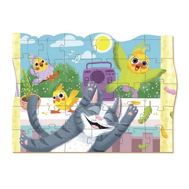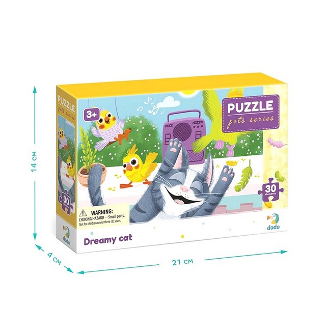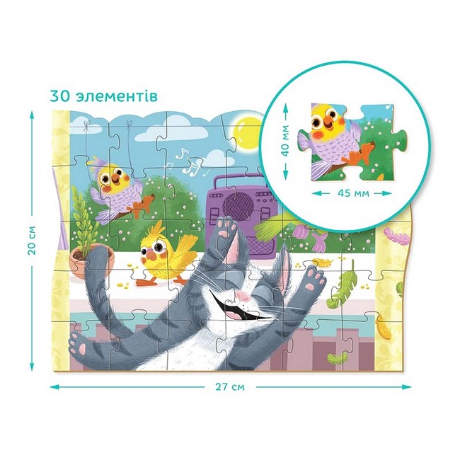 Який же приємний літній день. Сонечко світить, пташки співають, а по радіо грає весела пісенька. Та це ж улюблена пісня нашого котика-муркотика! Він так і стрибає від радощів, підспівуючи кожному слову. Пригоди веселих пухнастиків з серії «Домашні улюбленці» швидко розважать малечу. Зберіть усі чотири пазли та складіть єдину, веселу картинку. Виготовлені з якісного картону, пазли довговічні, приємні на дотик та зручні у використанні. Підходить для дітей від 3-х років, допомагає їм розвивати дрібну моторику, координацію та просторове мислення.
