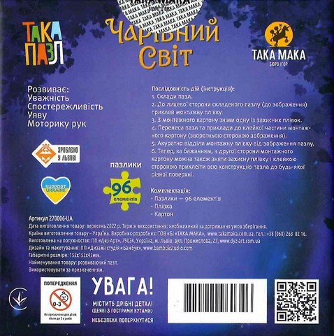 - пазли для дітей «Чарівний світ» містять 96 деталей для складання, картон і спеціальну плівку для виконання зображення;