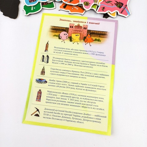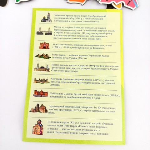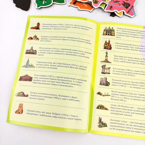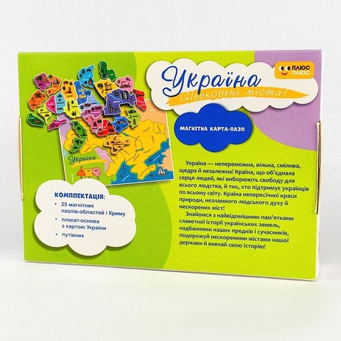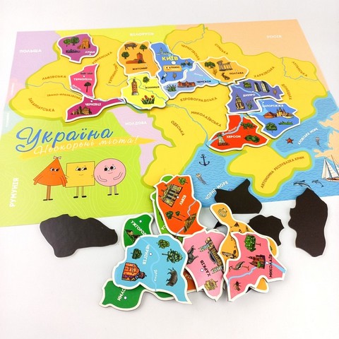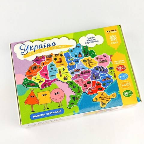 Великий пізнавальний, патріотичний пазл на магнітній основі з 25 елементів. Цікава розвага, тренажер для пам’яті й уваги. Розвиває дрібну моторику, мислення і фантазію дитини, знайомить з найвизначнішими пам’ятками різних регіонів нашої держави. Крім того, його можна збирати також на будь-якій вертикальній металевій основі, зокрема на холодильнику чи ігровій магнітній дошці.