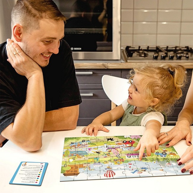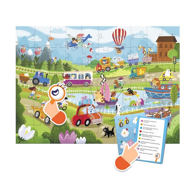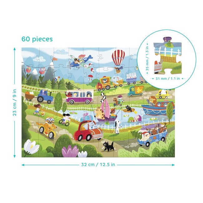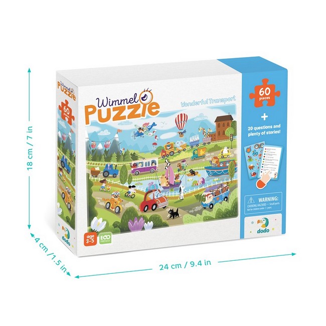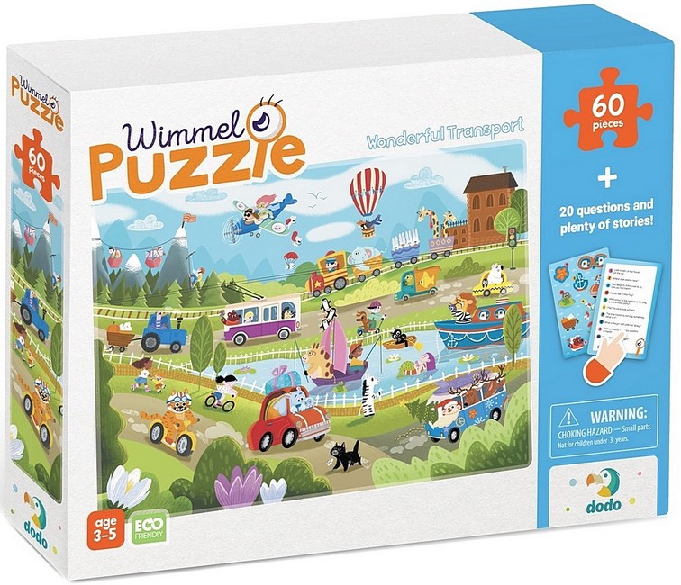 Що робити, якщо набридло ходити пішки? Обрати для себе транспортний засіб... Але який? Визначитися вашому малюкові допоможе наш вімель пазл, адже на ньому зображені, мабуть, усі існуючі варіанти транспорту: від повітряної кулі до земних роликів. На зображенні так багато транспорту та водіїв, що полічити їх здається викликом. А у вас вийде? Особливість вімель пазлу — кількість елементів на зображенні, адже пазл буквально кишить персонажами. Задача дитини — знайти потрібний елемент, який зазначений на картці із завданнями. Гра з таким пазлом вчить малечу кмітливості та концентрації уваги.