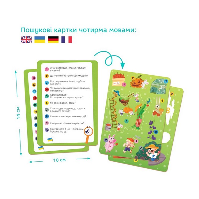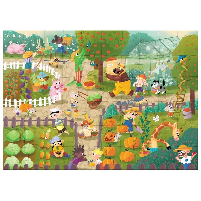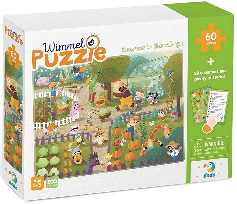 Як згадати, яке воно - літо в селі? Є два варіанти — можна дочекатися літа та гайнути до бабусі на черешні, або скласти наш пазл із зображенням трудових сільських буднів, де люди працюють разом із тваринками. На ньому так багато персонажів, що очі розбігаються у різні боки. Як думаєте, зможете знайти всіх? Особливість вімель пазлу — кількість елементів на зображенні, адже пазл буквально кишить персонажами. Задача дитини — знайти потрібний елемент, який зазначений на картці із завданнями. Гра з таким пазлом вчить малечу кмітливості та концентрації уваги.