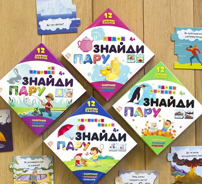 Знайди пару 4+ Удома 12 двобічних пазлів Кенгуру Ранок. Набір містить подвійні картки-пазли. На одній з половинок зображено сюжетну картинку, пов’язану з якимось явищем природи, на іншій – той чи інший предмет.