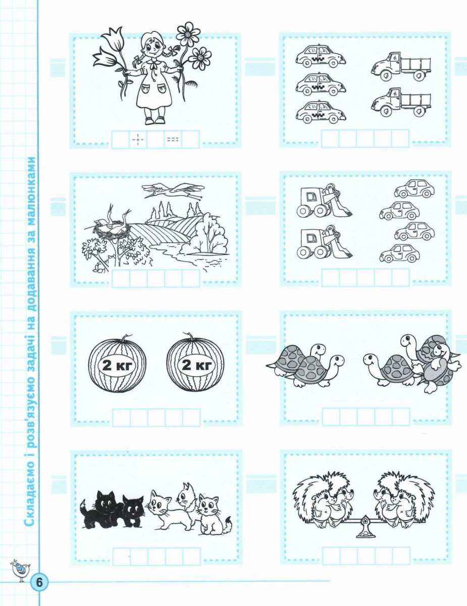 Інтенсивнй комплексний курс. Пропонуємо скористатися методикою, яку застосовано в нашому тренажері: дитина, дивлячись на малюнок, сама складає умову задачі своєю зрозумілою мовою для зрозумілих їй математичних дій. Побачите — це допоможе зробити великий крок до успішної роботи зі стандартними шкільними задачами. Увага! Усі тексти зошита призначено для читання дорослими.