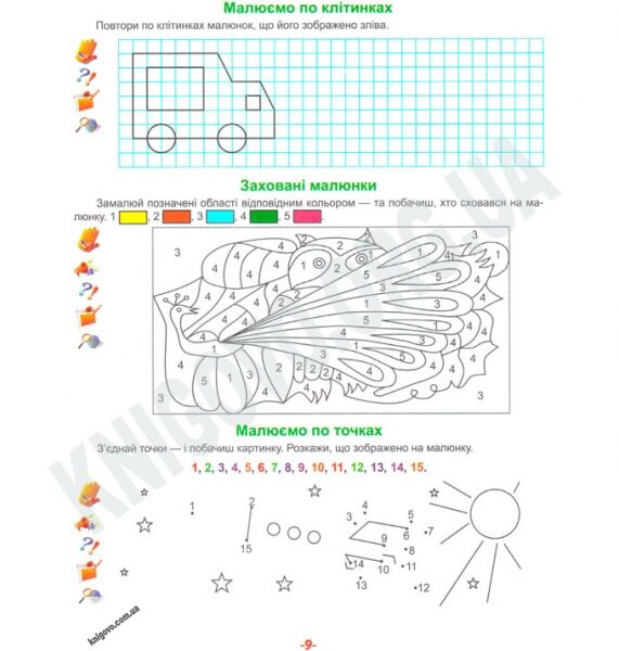 2. Графічні вправи: кожен розділ книжки включає графічні завдання, спрямовані на навчання дітей роботі з олівцем та формування правильного почерку.
