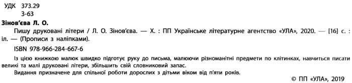 "Прописи з наліпками для дошкільнят. Пишу друковані літери" від Л. Зінов'євої, видавництва УЛА - це ідеальний навчальний посібник для дітей віком 5 років і старше, які вивчають алфавіт та готуються до навчання письма.