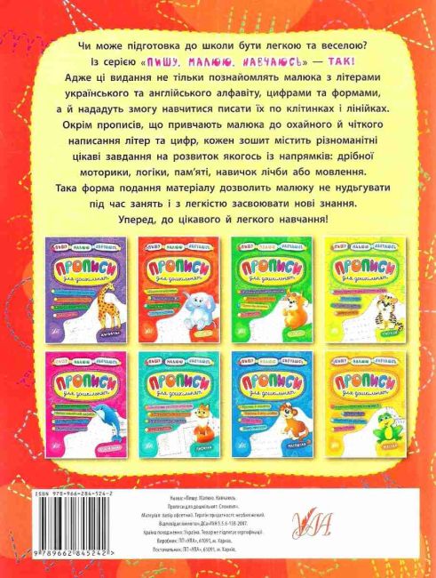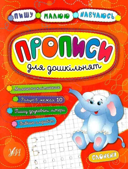 Прописи для дошкільнят Слоненя. Це видання ретельно й поступово підготує руку дитини до письма, познайомить її з друкованими літерами та надасть змогу навчитися чітко й красиво писати їх по клітинках, а також потренуватися рахувати в межах 10.