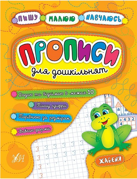 Прописи для дошкільнят Жабеня. Зошит спрямований на розвиток дрібної моторики та математичних навичок: дитина навчиться писати цифри, вивчить назви геометричних фігур, познайомиться з поняттями форма та розмір, а також потренується додавати та віднімати в межах 10.