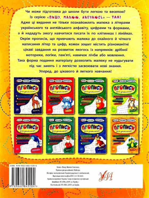 Прописи для дошкільнят Жабеня пишу малюю навчаюсь - це відмінний посібник для навчання письма та розвитку моторики дитини. Завдяки яскравому дизайну та цікавим вправам, ваш малюк зможе з легкістю вивчити алфавіт та розвивати моторику руки.