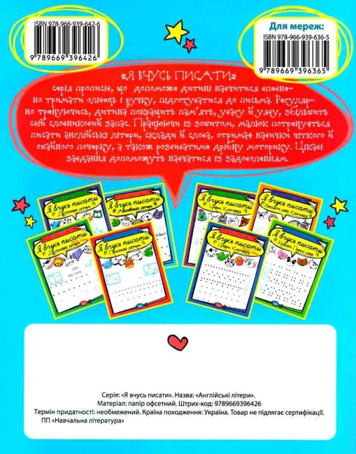 Я вчусь писати Англійські літери. Прописи містять завдання, що допоможуть дитині розробити дрібні м’язи руки й досягти правильної координації пальців під час письма. Виконуючи кожну вправу, малюк легко опанує перші навички письма, малювання, обведення. Це сприятиме розвитку основних вікових навичок дрібної моторики, уваги, логіки тощо. Для дітей дошкільного віку згідно з державним стандартом України.