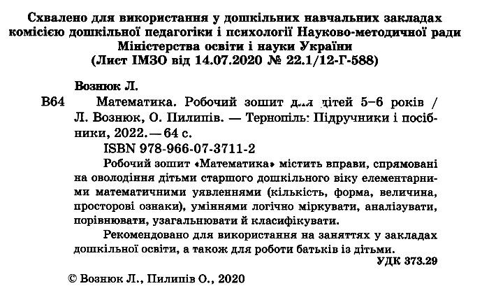 Робочий зошит Дошкілля Математика 5-6 років Готуємо дитину до школи Вознюк Л. Підручники і посібники Робочий зошит Математика містить вправи, спрямовані на оволодіння дітьми старшого дошкільного віку елементарними математичними уявленнями: кількість, форма, величина, просторові ознаки; уміннями логічно міркувати, аналізувати, порівнювати, узагальнювати й класифікувати.