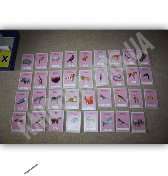 1. 34 картки із зображеннями тварин, на кожній картці є слово-назва і звукова модель слова.