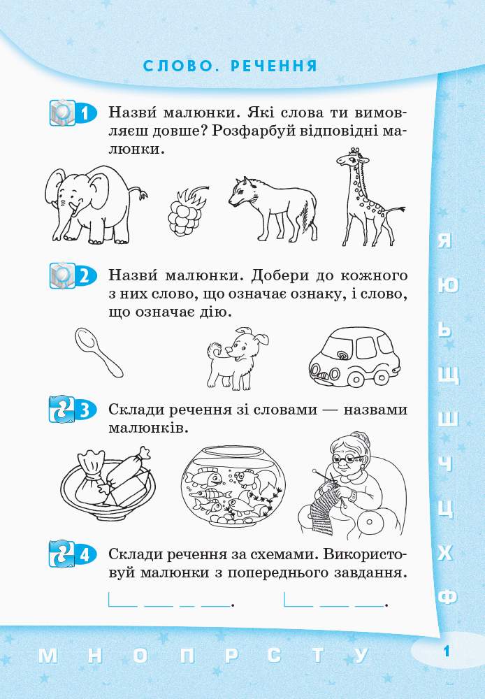 На сторінкахзошита діти навчаться складати речення за схемами та малюнками, поєднувати звуки в склади, а склади у слова, робити звуковий аналіз слів, розрізняти звуки.