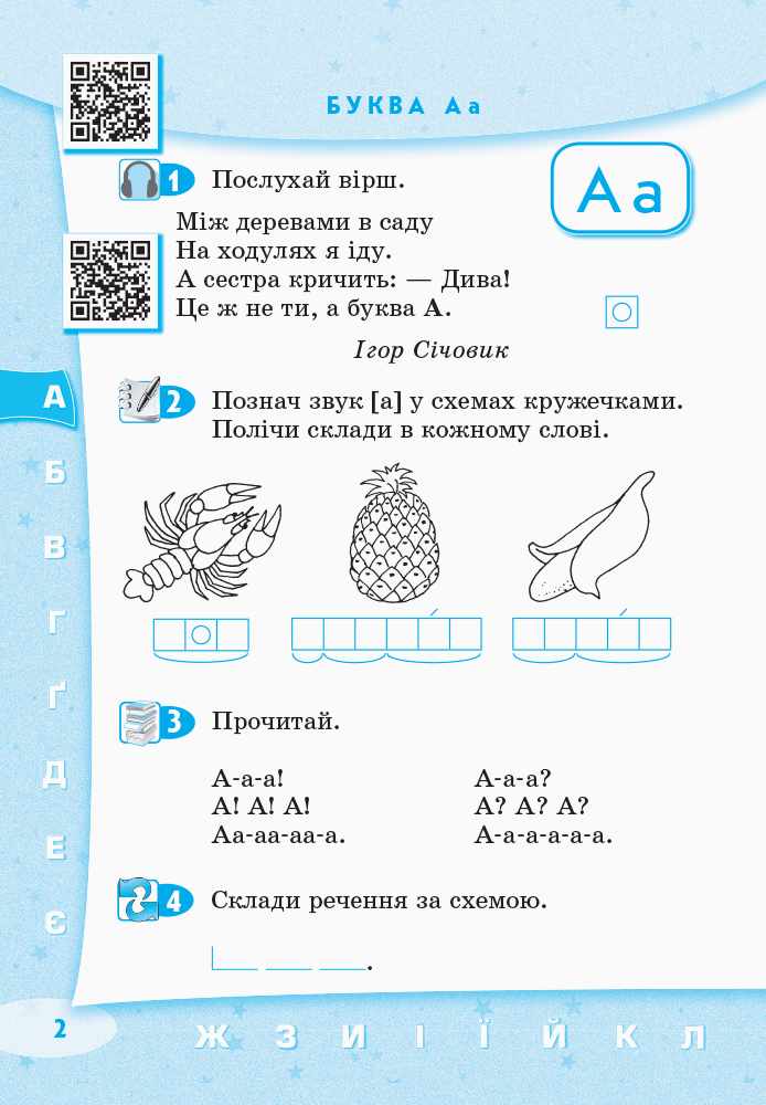 Посібник також містить скоромовки, чистомовки, загадки, вірші про букви. Крім того, дошкільнятам пропонується штрихувати, наводити, домальовувати елементи букв, «заховані» в зображеннях предметів і тварин,тобто готувати руку до написаннябукв. На сторінках посібника розміщено QR-коди, за допомогою яких можна швидко перейти до додаткового матеріалу у вигляді презентацій та аудіозаписів.