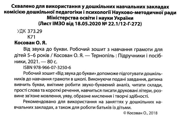 "Від звука до букви. Робочий зошит з навчання грамоти для дітей 5-6 років" від автора О. Косована - це навчальний посібник, розроблений для допомоги дітям у вивченні алфавіту та початкових навичок читання і письма.